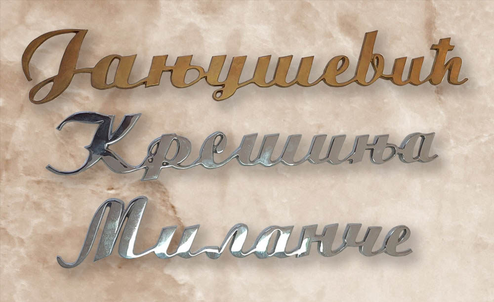 Slova i brojeve izrađujemo prema zahtevu kupca od mesinga i od prohroma. Veličine se odredjuju prema veličini ploče.